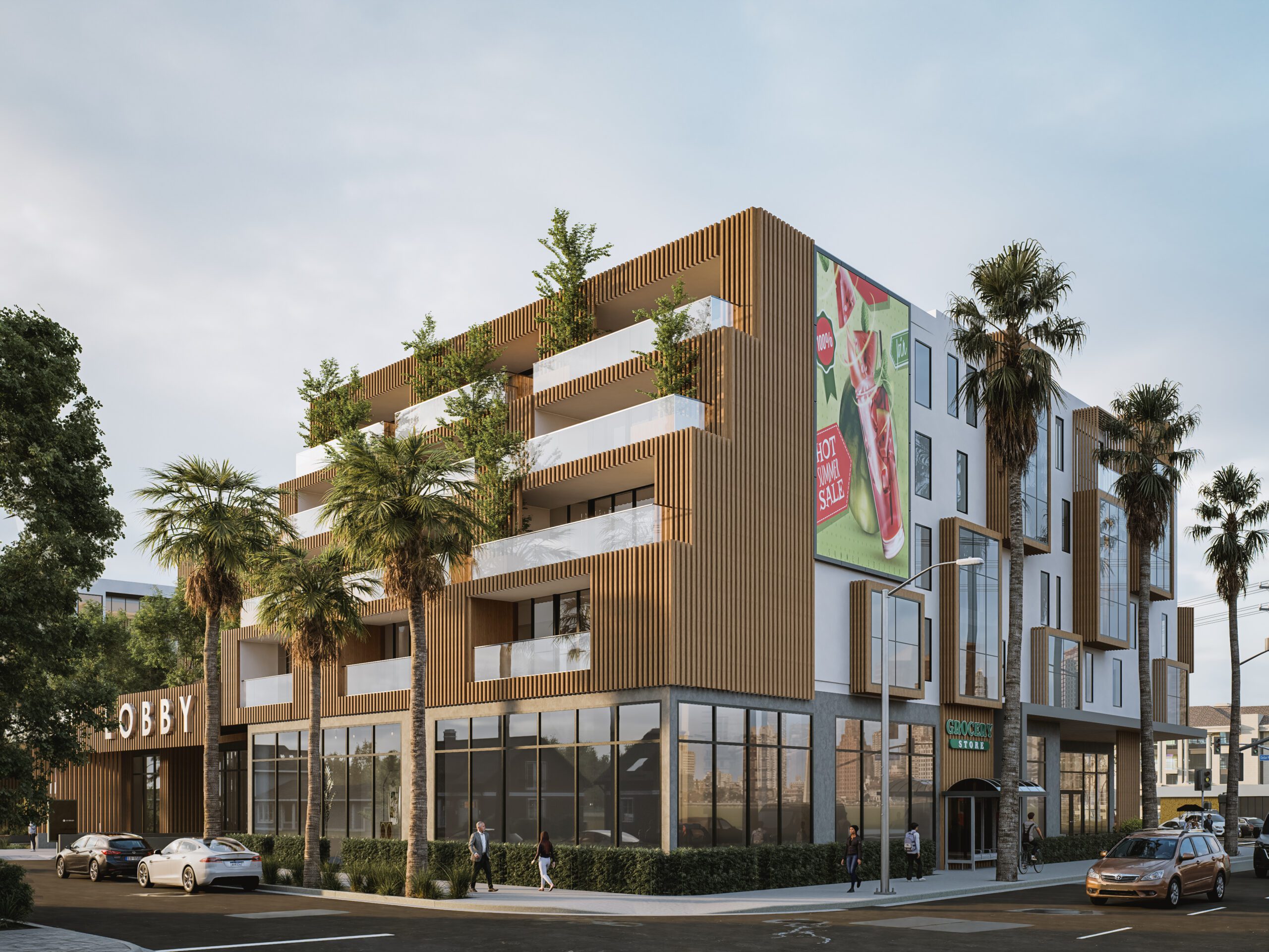Ground-floor commercial areas, including a grocery store and boutique shops, provide convenience and vibrancy, turning the complex into a dynamic urban hub.